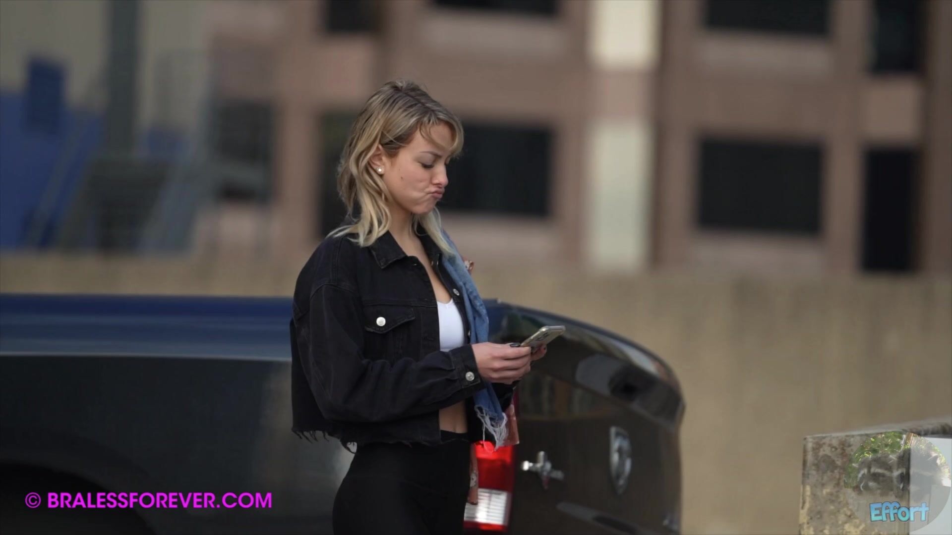 Blonde babe teases her tits outdoors in the city in this public video.